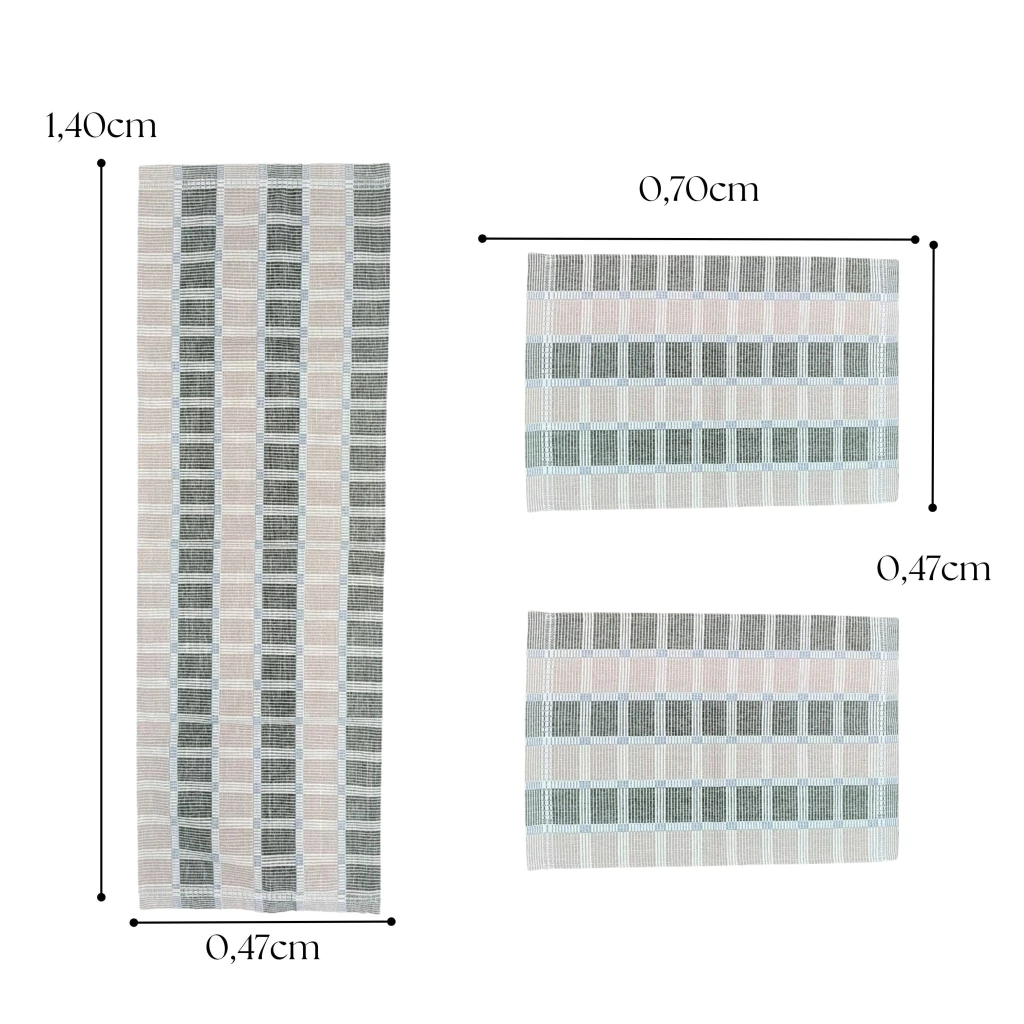 Contém Kit Passadeira – 2 tapetinhos (0,47x0,70m) e 01 passadeira (0,47x1,40m)