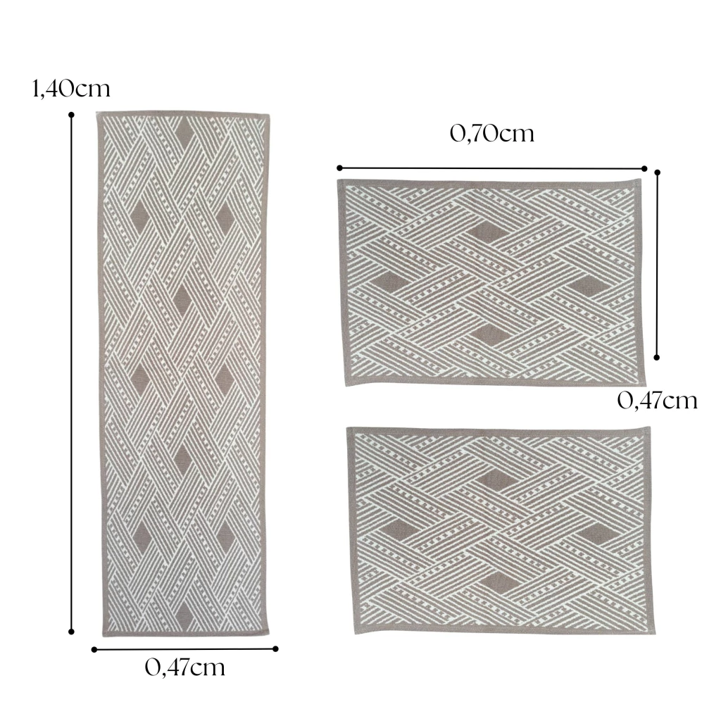 Contém Kit Passadeira – 2 tapetinhos (0,47x0,70m) e 01 passadeira (0,47x1,40m)